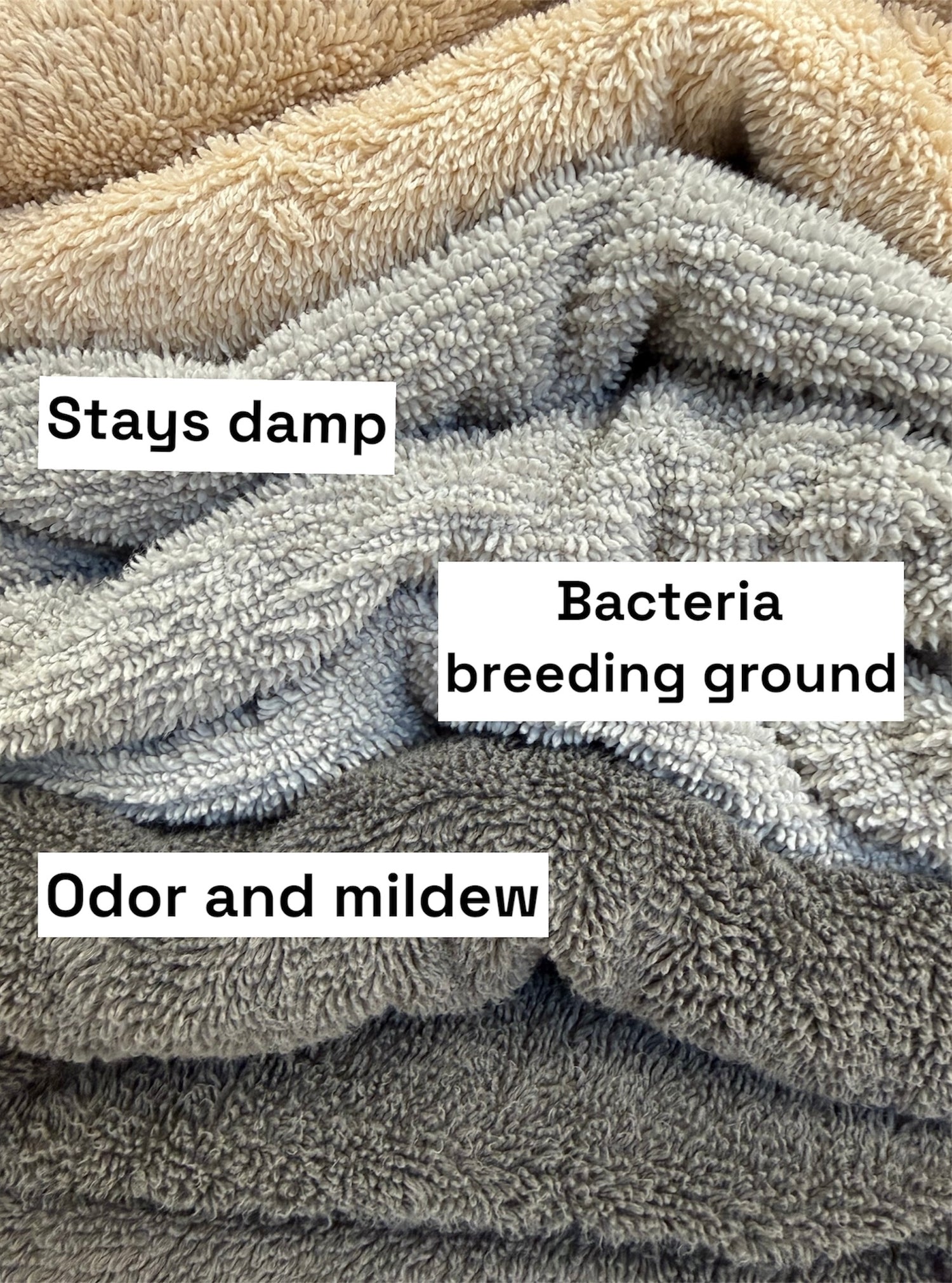 Other towels stay damp far too long, trapping moisture that allows bacteria to grow, mildew to form, and unwanted odors to take hold